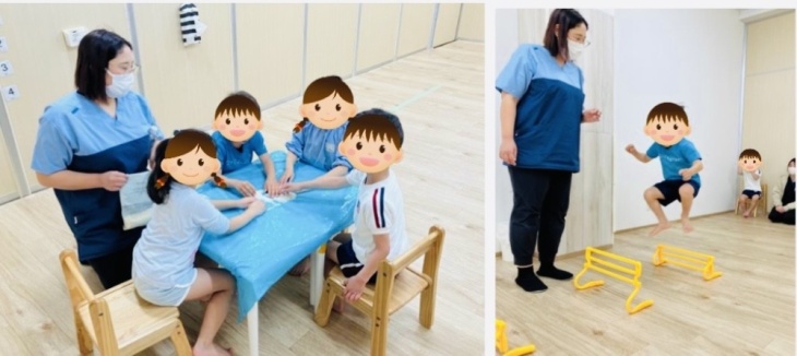 サーキットでは手押し車でコーンをよけながら進み、フープの中で片足立ちを行い、最後に棒を使ってバランスボールを枠に入れる練習をしています。机上学習では、製作で両面テープをはがす練習と紙テープをちぎって貼る練習を最後まで集中して頑張っています😊