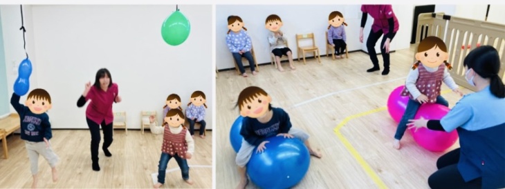 マラソン:全身運動・持久力・ルールを守る、動物ウォーク:模倣・下肢筋力・上下肢の連動性、風船遊び:目と手の協調性・ジャンプ力・力の調整・感覚刺激・バランス などを目的に取り組みました✨ マラソンや動物ウォークではルールをしっかり守り、お友達と楽しく体を動かすことができましたよ☺風船遊びではジャンプを頑張り、風船にタッチすることができました✨