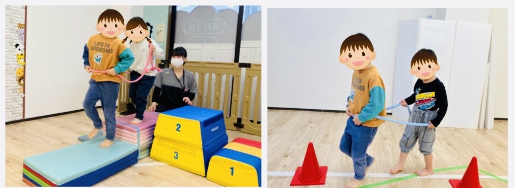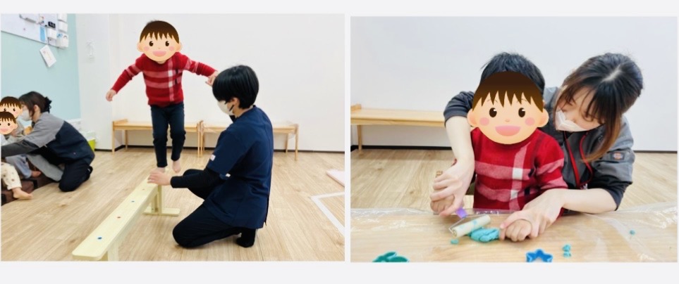 平均台に乗った時に、少しずつ1人で進む事ができてきています✨苦手なセンサリーマットも慣れてきたのか自分から歩いてくれました😊✨粘土遊びは手に付くのが嫌だったようですが、先生がこねたものを触る様子が見られましたよ👏✨